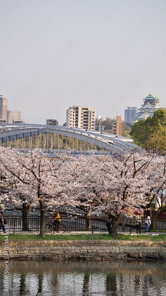 City and bridge skyline background with blooming cherry blossom trees in the foreground