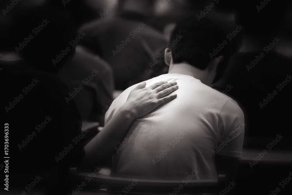 A Christian who places his hands on the backs of people in despair during prayer time, comforts them, and prays with tears in his eyes.