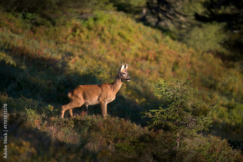 a young roe buck, a yearling, in the sunrise on a mountain meadow at a autumn morning