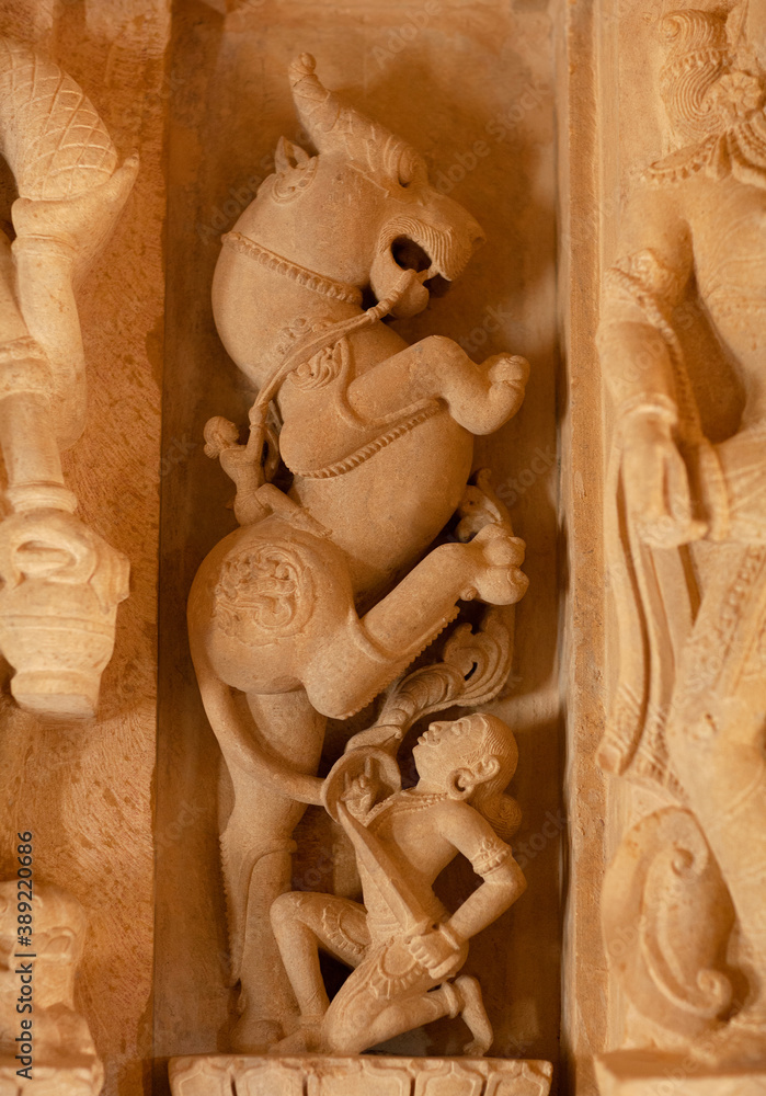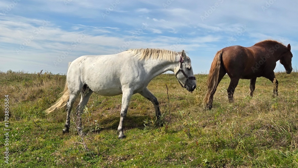 Thoroughbred horse mare on pasture. Farm animal. Pair of Horses in pasture