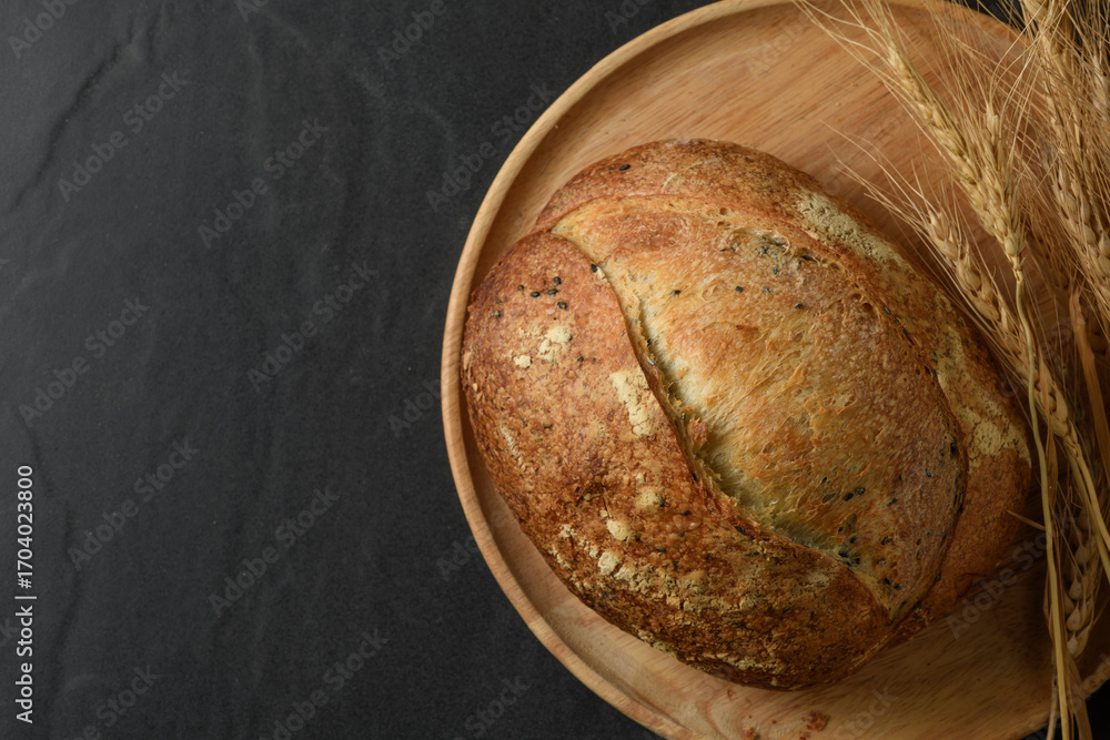 Top view of a freshly baked, crusty artisanal sourdough loaf, presented on a rustic wooden plate. A serrated knife rests beside the bread