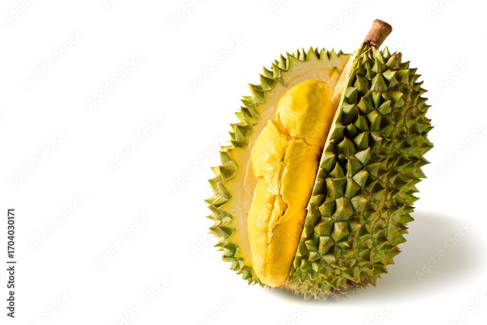Ripe durian fruit or Durio zibethinus with yellow creamy pulp exposed, isolated on white background. Known as the king of fruits in Southeast Asia. Popular in Thailand, Malaysia, and Indonesia.