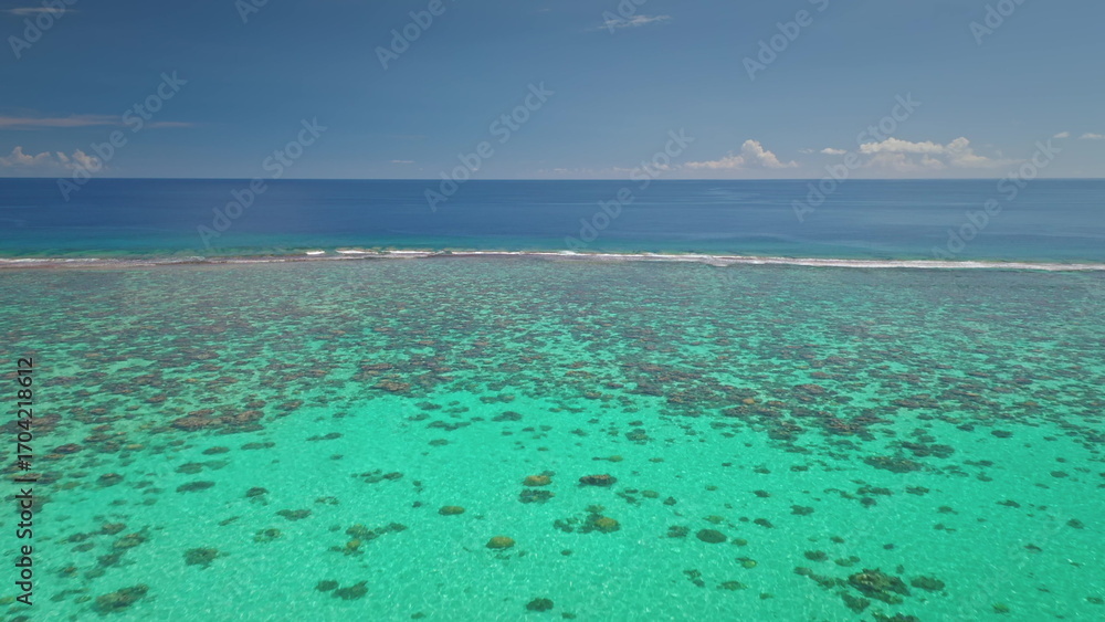 Stunning drone captures the vibrant coral reefs beneath the turquoise waters near Tahiti island, showcasing the beauty and biodiversity of the south pacific ocean under a clear blue sky