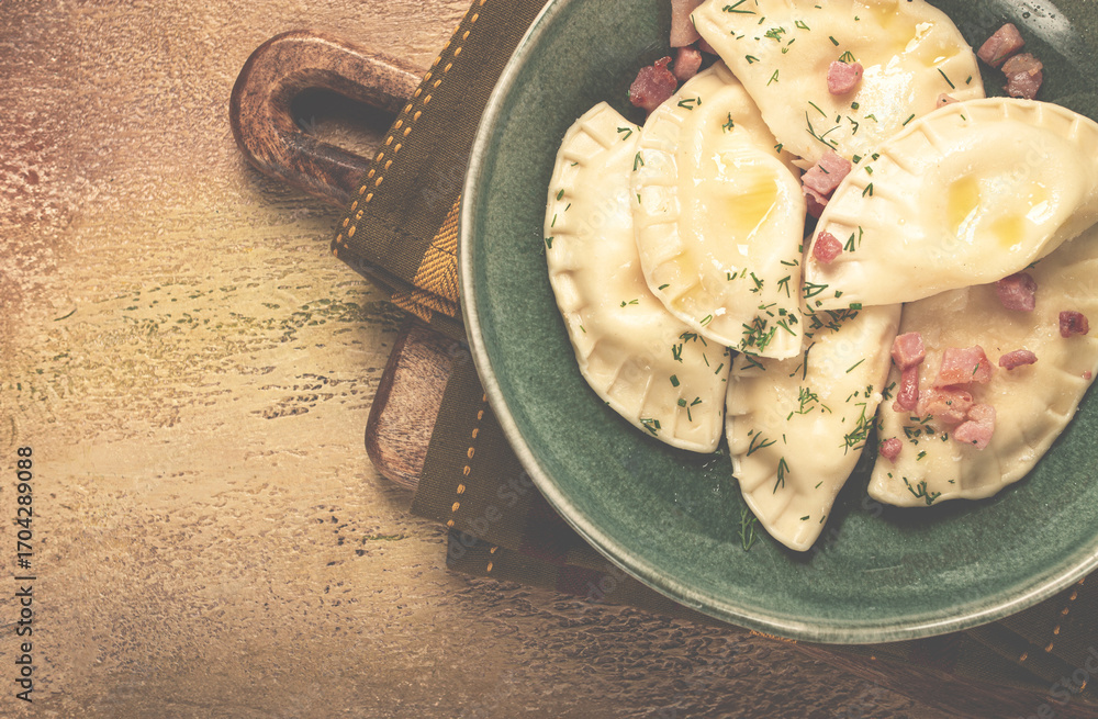 Dumplings, with fried prosciutto, a traditional dish of Polish cuisine, dumplings, top view, close-up, without people,