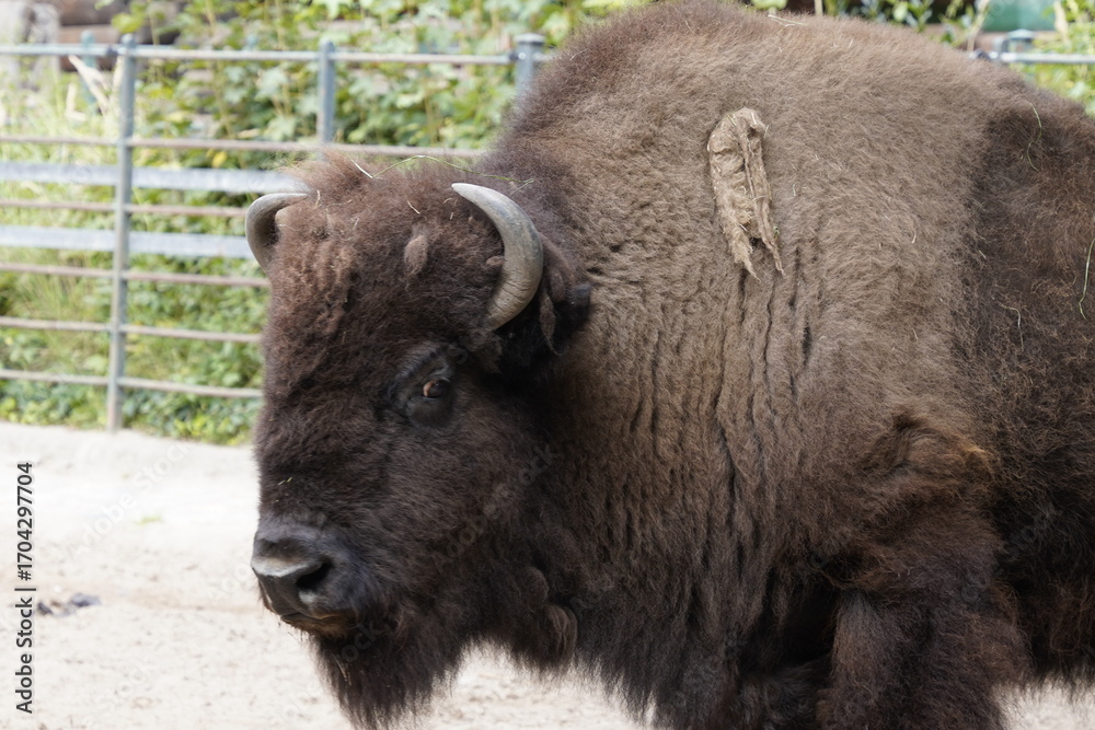 Side profile close up portrait of the head of a male American bison, or American buffalo, with large horns and dark brown fur