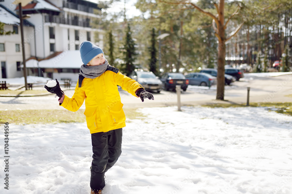 Preteen boy having fun playing with fresh snow. Snow fight.Child having fun during vacation in european Alps.Active winter outdoors leisure for kids on holidays time