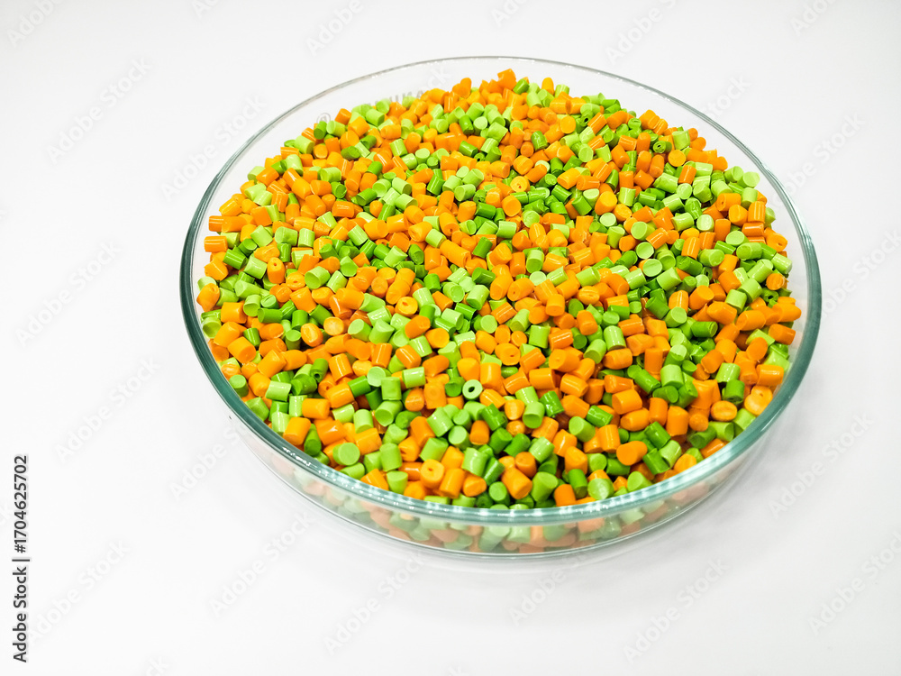 plastic masterbatch, masterbatch granules, polymer carrying pigment poured into a glass cup forming a circle with a white background, as a product catalog design for a plastic industry company profile