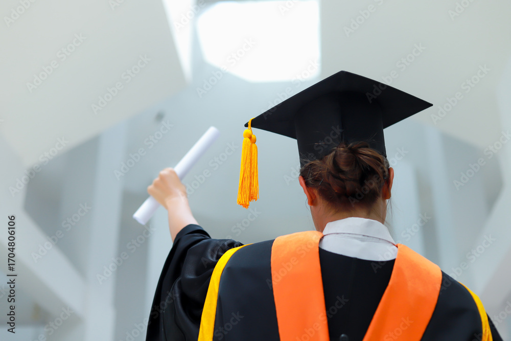 Back view of graduates celebrating their college graduation with pride and joy on graduation day. Congratulations.