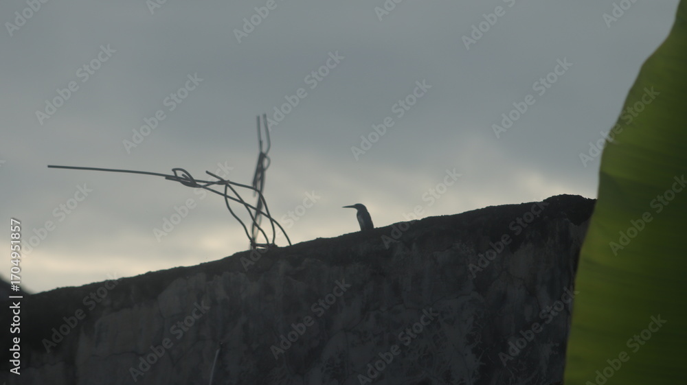 The silhouette of a kingfisher perched on a roof in the morning is very charming.