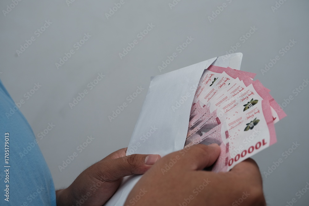Close-up of hands holding an envelope containing Indonesian rupiah banknotes, representing salary payment, financial transaction, or money savings.