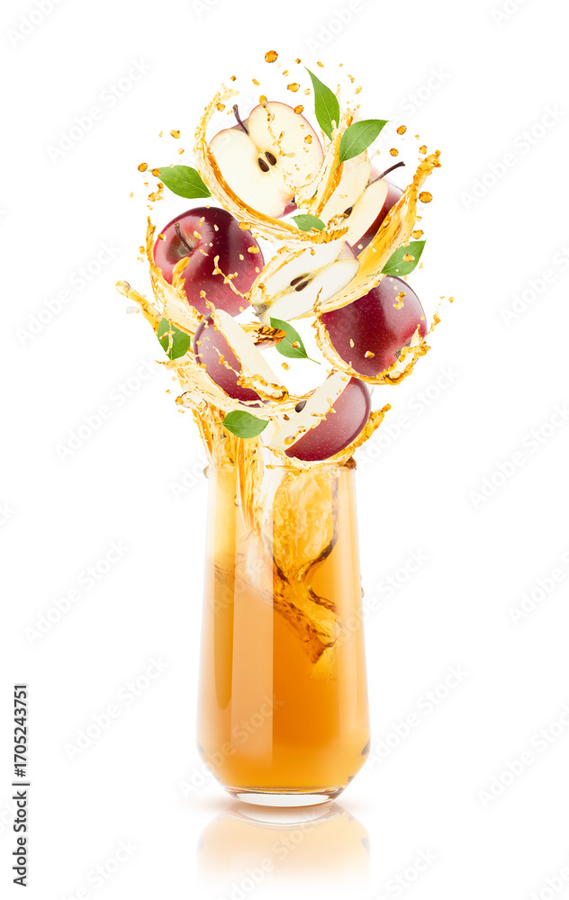 Organic apple cider with juicy streams of juice, drops, slices red apples, green leaves, filling a clear glass. Ideal for wellness, nutrition branding, advertising, design, poster. White background.