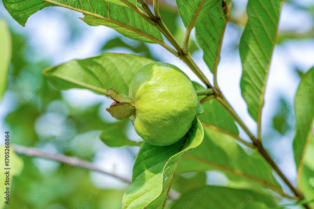 Fresh young guava fruit on tree branch with natural green bokeh background, high resolution photography.