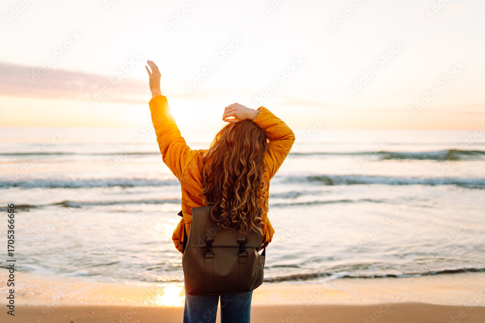 A beautiful woman with a backpack strolls along the shore at dawn. The traveler enjoys the seascape in the sun's rays. Concepts of travel, enjoyment, and freedom.