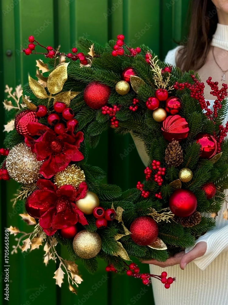 woman holding christmas wreath with red and gold ornaments