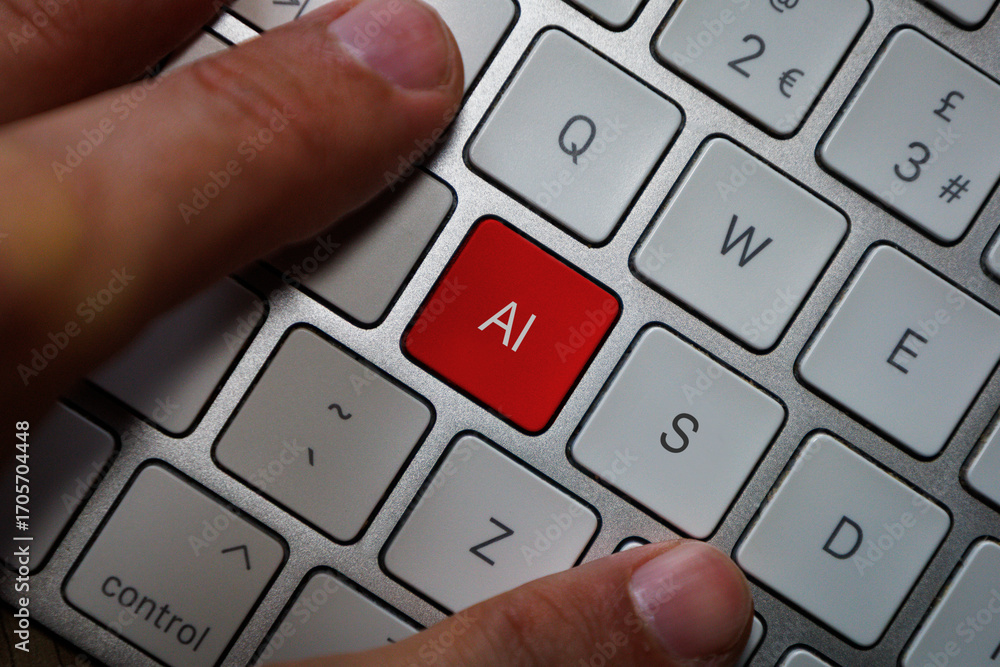Modern computer keyboard featuring a dedicated red AI button, symbolising artificial intelligence, technology innovation, and future digital tools