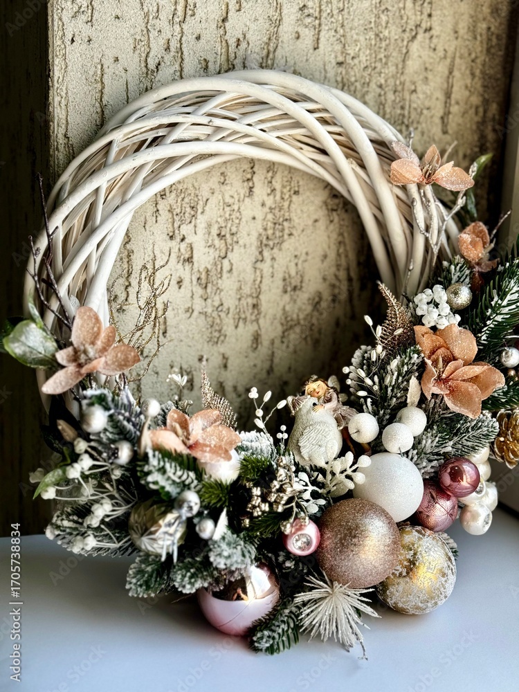 festive christmas wreath with pink ornaments
