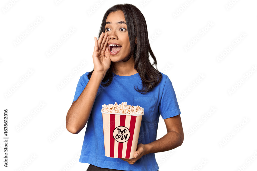 Young man with clapperboard in studio is saying a secret hot braking news and looking aside