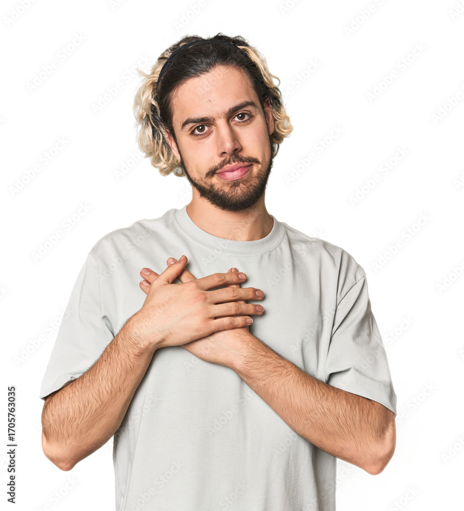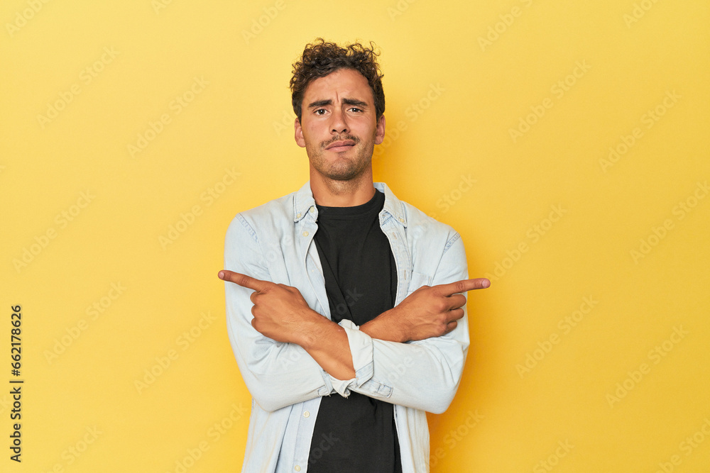 Young student with backpack and headphones relaxed thinking about something looking at a copy space.