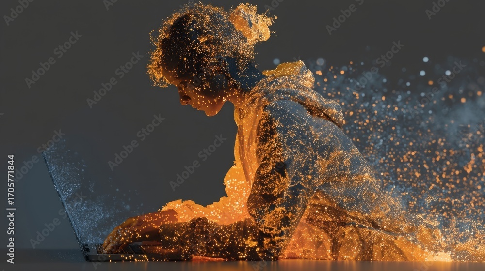 A glowing silhouette of a person composed of vibrant orange and gold particles,