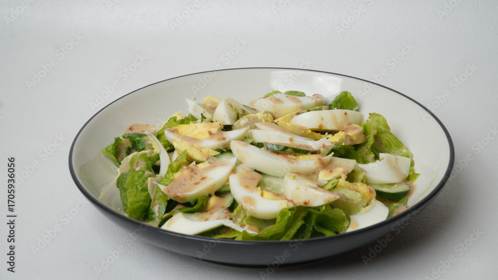 A serving of salad consisting of sliced romaine lettuce, Japanese cucumber (kyuri), and boiled egg then topped with roasted sesame salad dressing served on a white plate and white background.