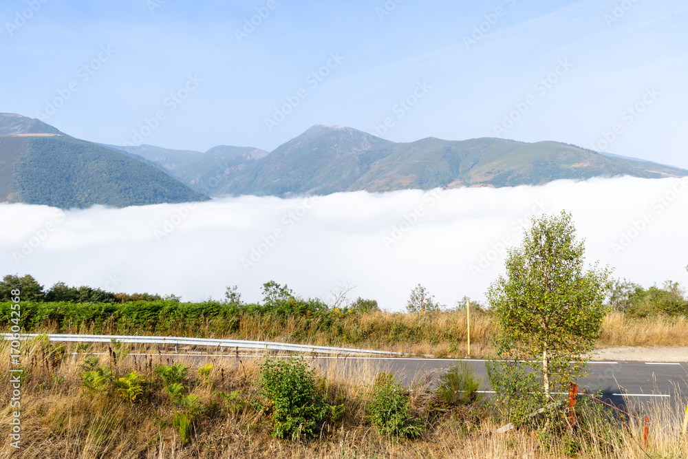 Leitariegos Pass, in Asturias, covered in fog with the mountains in the sun