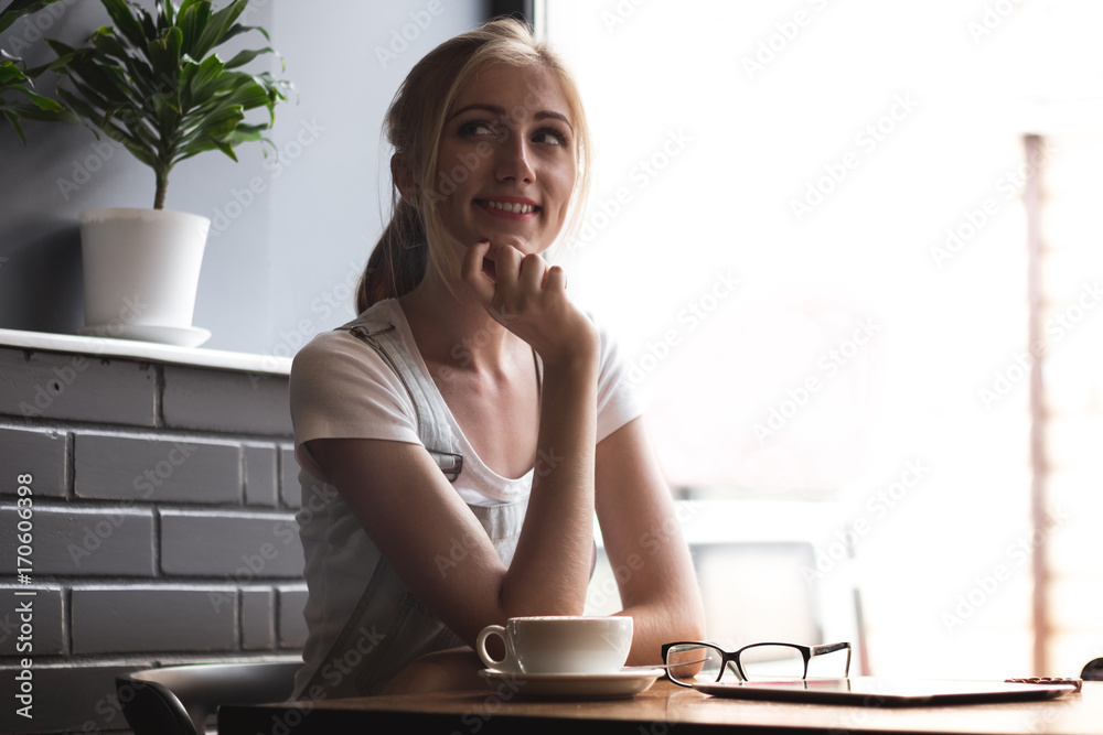 Starting new day in cafe. Side view of young attractive woman looking away while sitting in cafe with the cup of coffee.