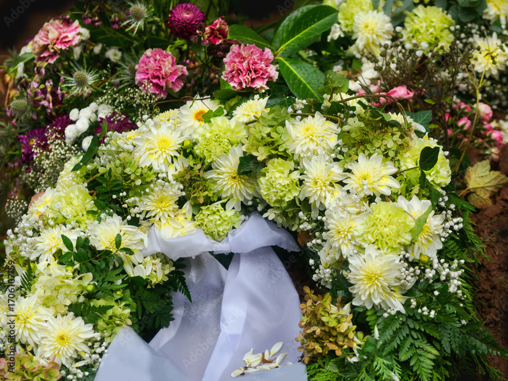 Trauer am Grab mit vielen schönen zarten Blumen Gestecken, ohne Namen