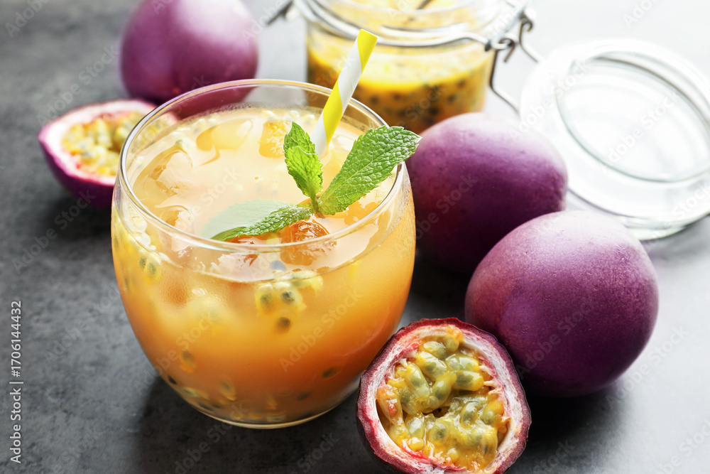 Tasty passion fruit drink with mint and fresh fruits on grey table, closeup