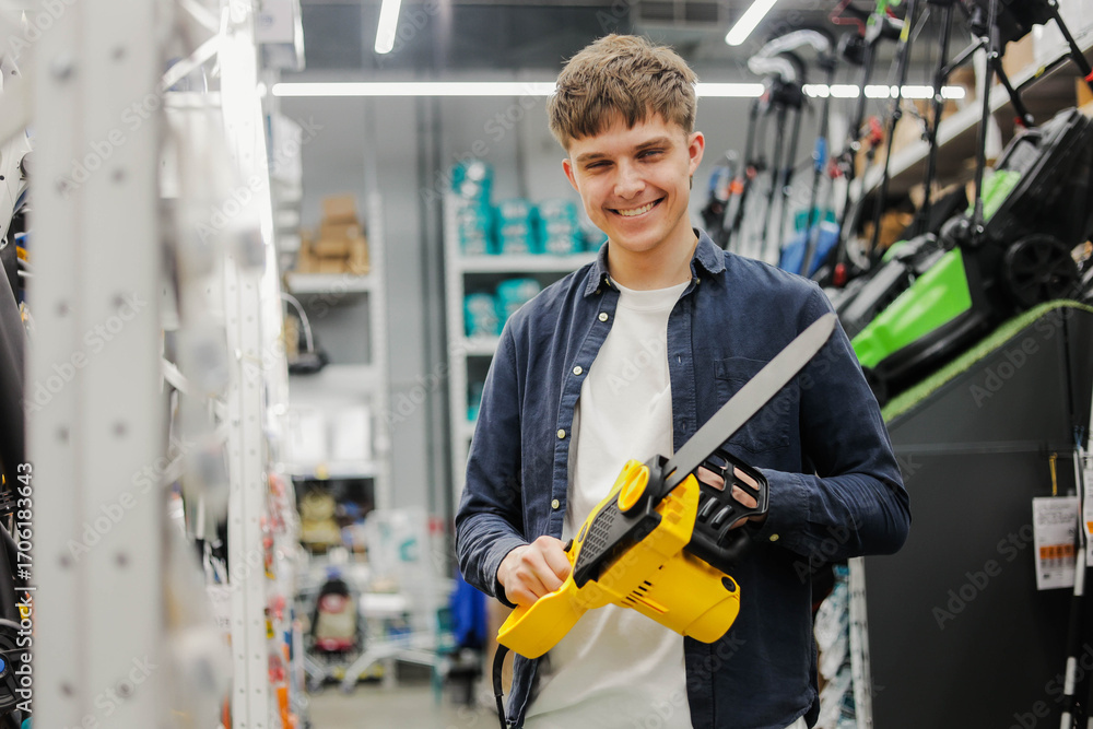 Young man choosing an electric chainsaw in a hardware store. Male customer standing in the power tools section, inspecting electric chainsaw. Concept of home renovation and tool shopping.