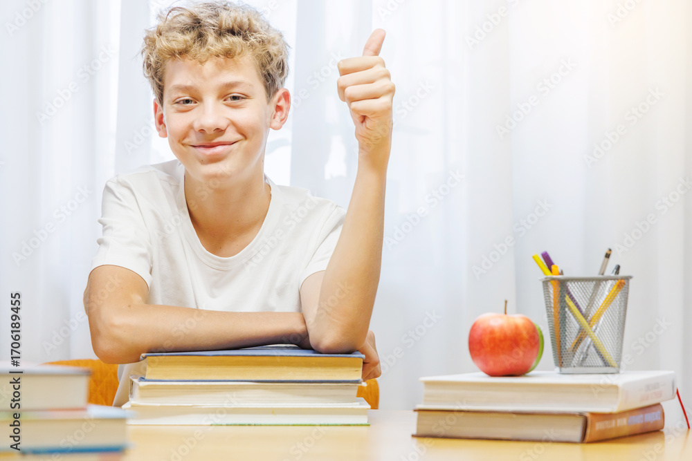 Schoolboy studying at home with notebook, and learning materials, smiling happily