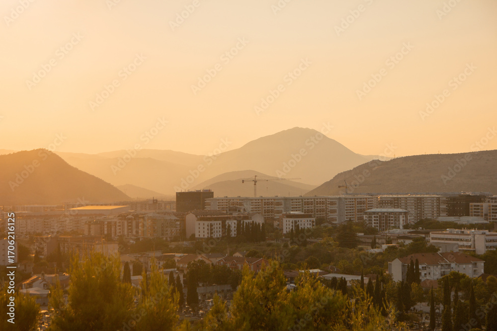 Cityscape with mountains at sunset haze (horizontal)