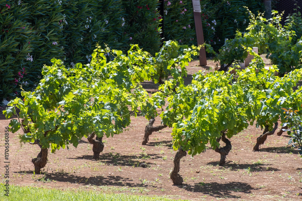 Wine industry on Sicily, green vineyards of grillo grapes near Trapani and Marsala famous wine making regions, South of Italy