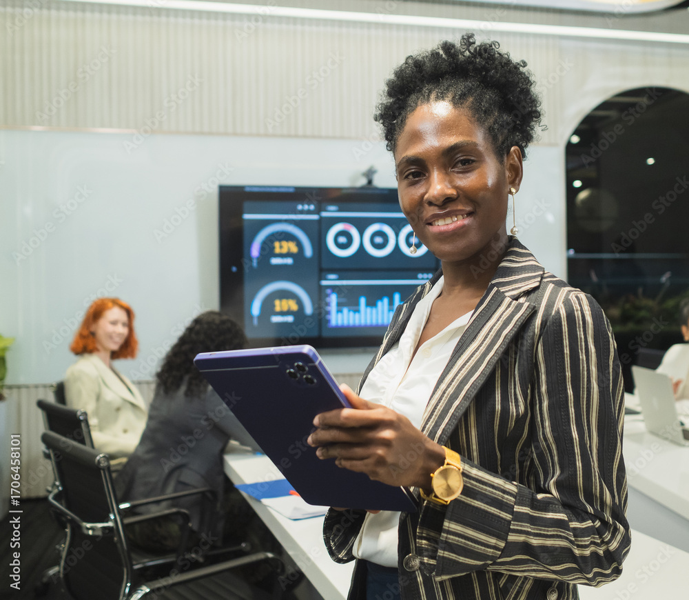 business black woman holding tablet stand in modern office during professional business meeting. background colleagues engaged in discussion while large screen display chart graph percentage metric.