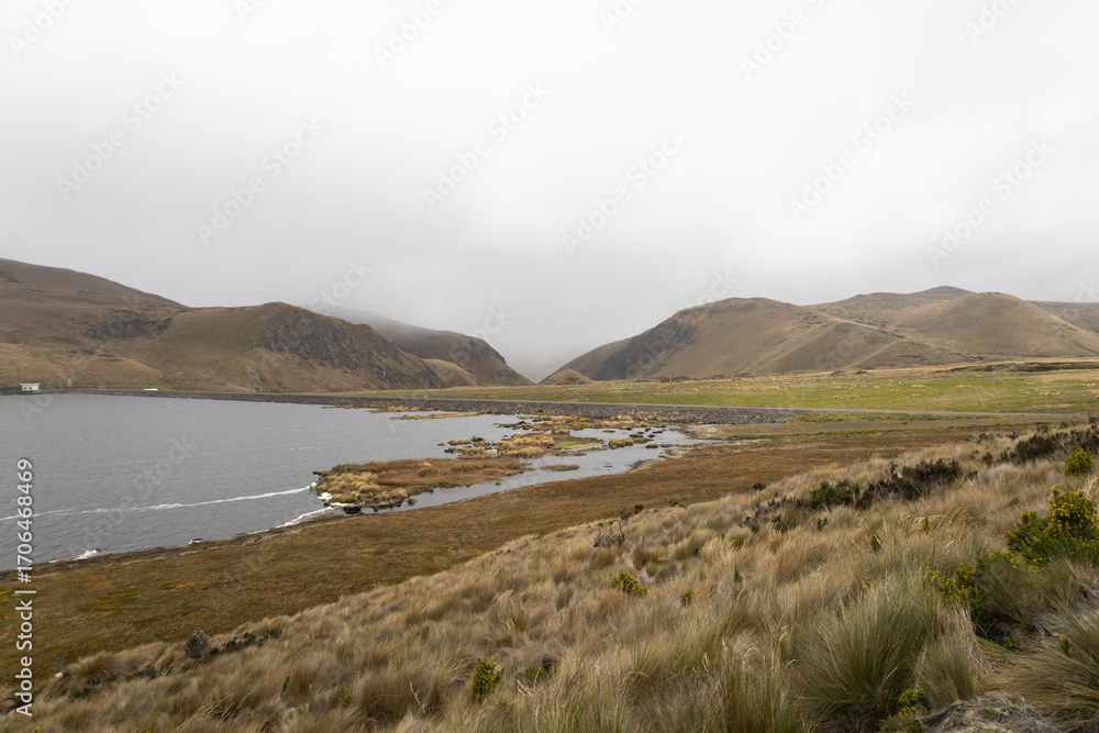 Calm Andean lake surrounded by misty mountains and pramo grass, creating a serene natural highland landscape view.