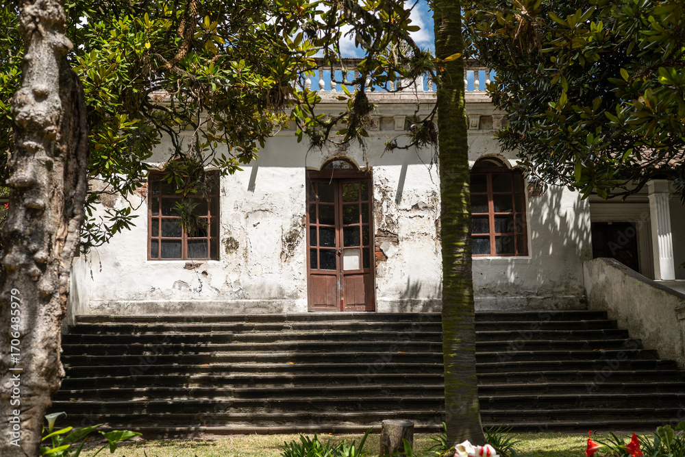 An old building with worn white walls and wooden windows, fronted by a wide staircase and shaded by surrounding trees.
