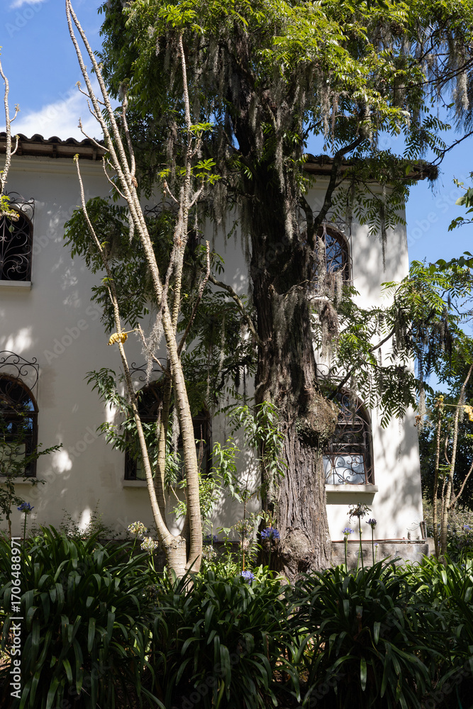 Charming Ecuadorian colonial hacienda with clay roof tiles, white arches, and lush greenery, showcasing rustic elegance and timeless countryside heritage.