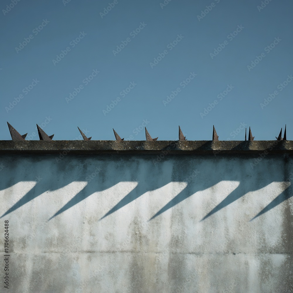 Low angle view of rooftop pigeon spikes casting thin shadows against wall urban bird deterrent eerie geometry natural hard light and urban detail 43 aspect ratio