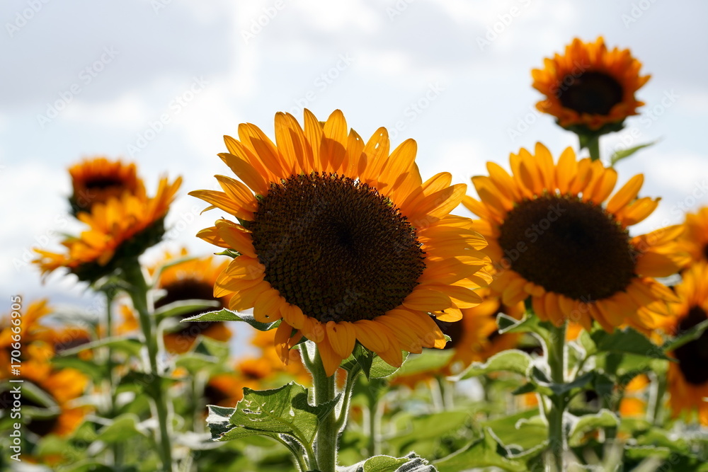 晴れた夏の日に畑一面に咲き誇るたくさんのひまわりを捉えた写真です。太陽に向かって咲くひまわりの姿が生き生きとしています。