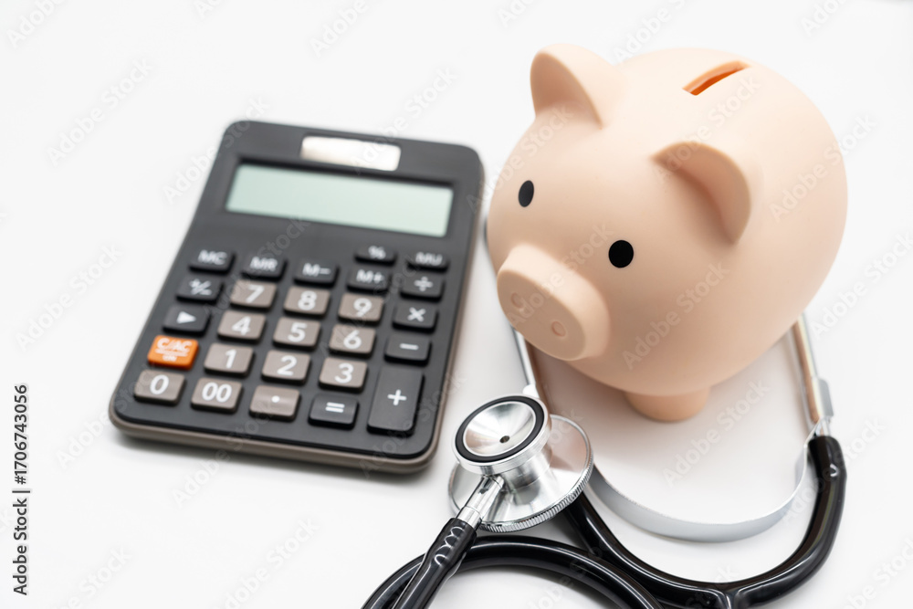 Calculator, Piggy bank and stethoscope on white background health medicine theme with copy space. Health care costs or medical insurance.
