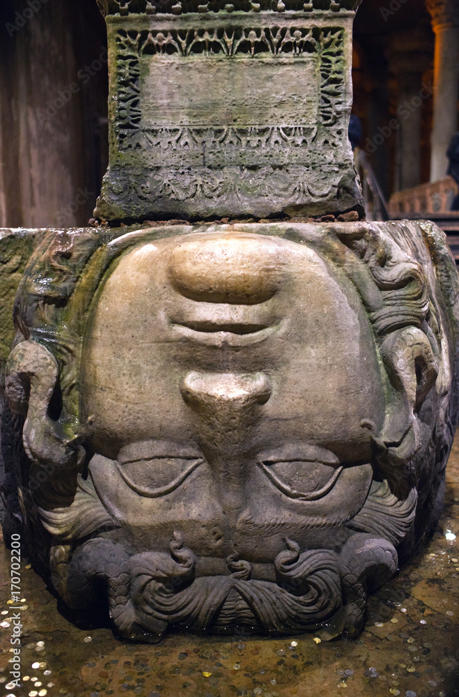 Column with inverted Medusa head base in Basilica Cistern in Istanbul, Turkey