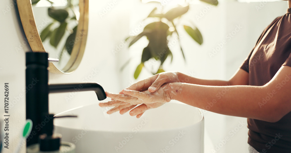 Basin, soap and washing hands with person in bathroom of home for morning routine or skincare. Cleaning, hygiene and protection with self care in apartment for removal of bacteria, dirt or germs