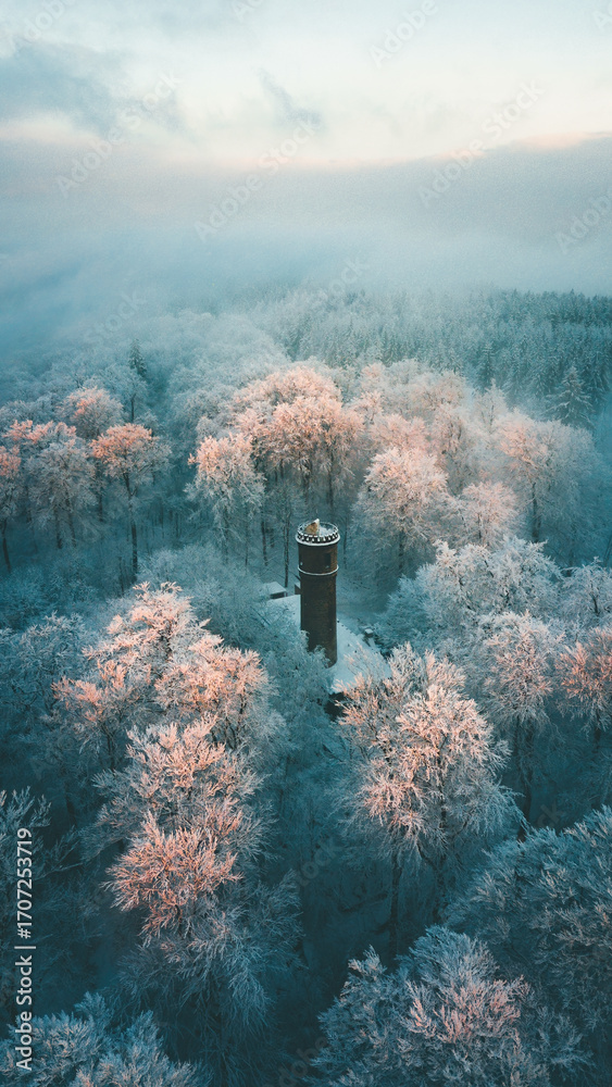 Fairy tale tower in a winter forest
