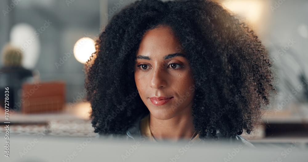Computer, reading and business woman in office for content writing, review article or think at night. Tech, overtime and African copywriter with inspiration for blog, email campaign and research