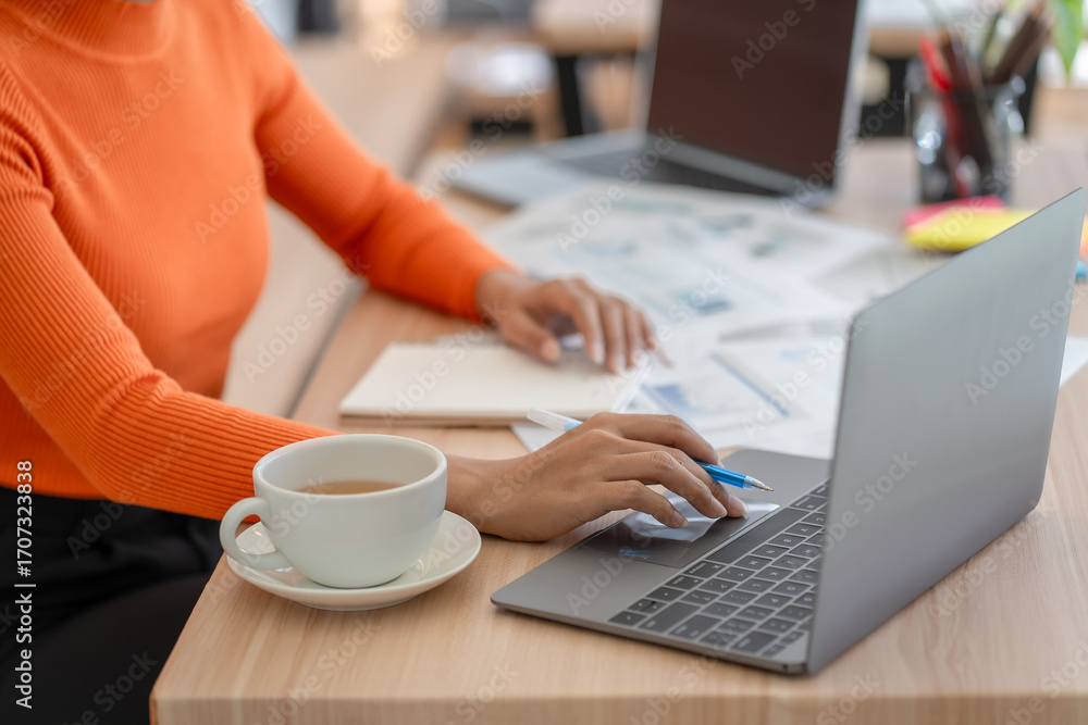 Business woman working on laptop or notebook in her office.