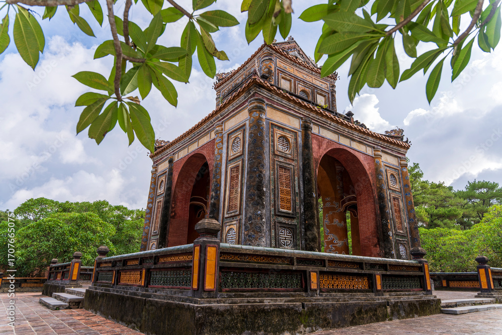 The Triple Gate (Tam Quan), a two-tiered, ornate structure with arches and elaborate ceramic detailing, is framed by leaves at Tu Duc tomb, Hue.