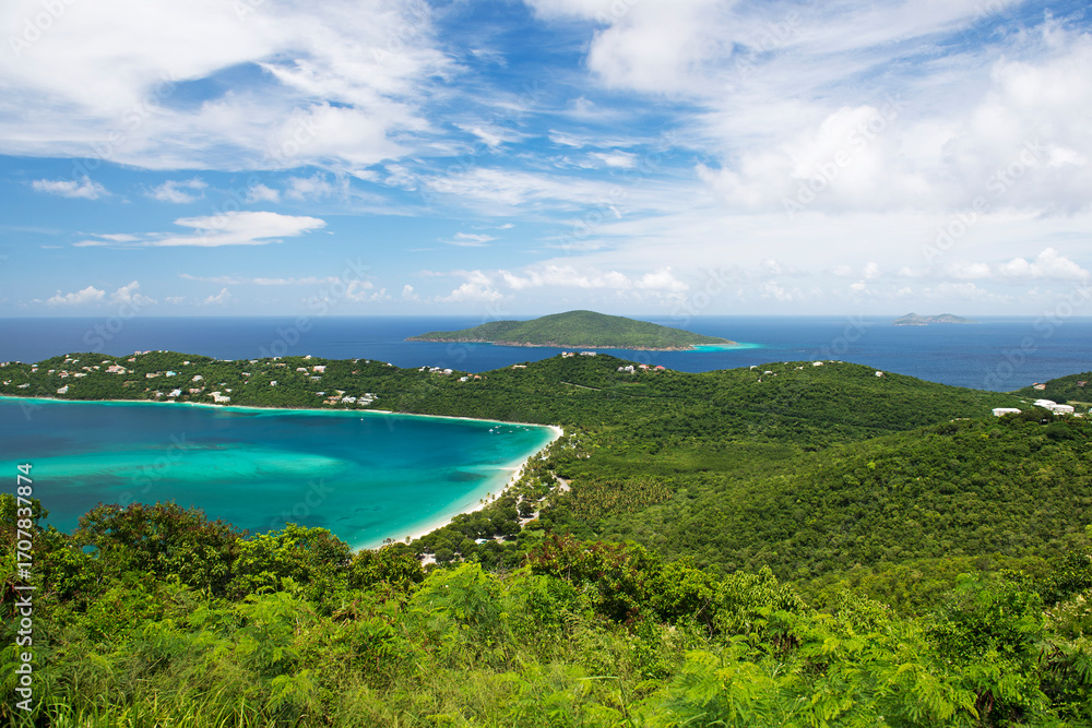 Magens Bay Beach, St. Thomas. Aerial view of turquoise bay, white sand and lush green hills, iconic Caribbean paradise