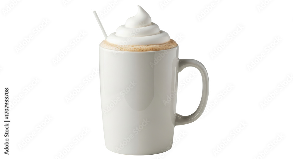 Isolated frothy mocha latte with whipped cream topping served in large gray mug drink