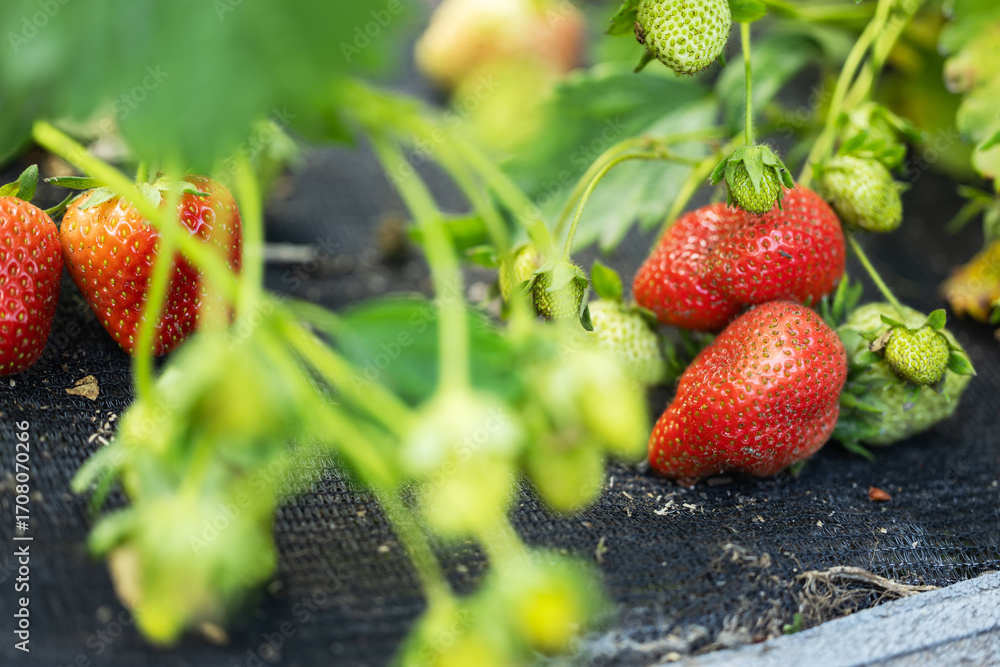 Strawberry plant bearing fruits, showing ripe red and unripe green strawberries,