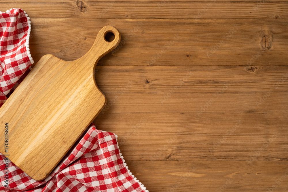 Top view of a rustic wooden cutting board atop a red checkered cloth background