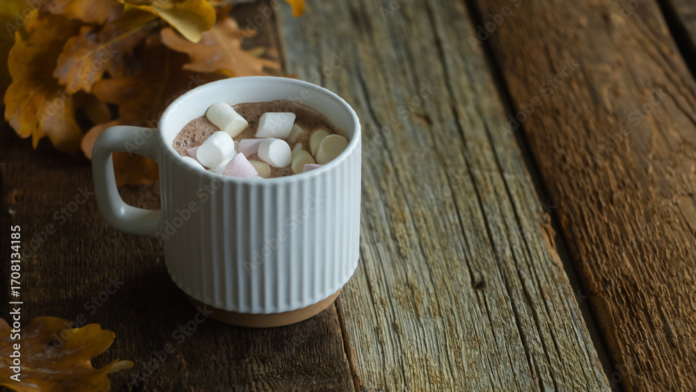 Cozy autumn drink. Mug of hot chocolate or cocoa adorned with marshmallows on rustic table.